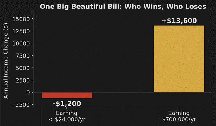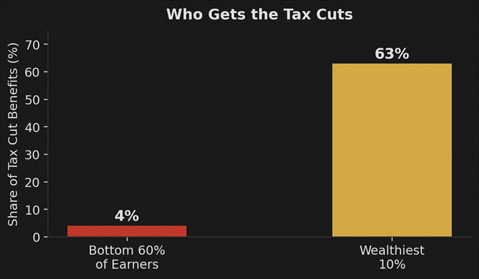 Then the food stamps. “We have lifted 2.4 million Americans off of food stamps,” he said. Republicans rose and cheered. His One Big Beautiful Bill slashed $187 billion from food assistance over ten years—the largest cut in the history of the United States. Nobody was “lifted” off food stamps. 2.4 million people had food taken from their mouths so billionaires could keep their tax cuts. The Congressional Budget Office confirmed it: people earning less than $24,000 a year lose $1,200 annually. Those earning $700,000 gain $13,600. The wealthiest 10% receive 63% of the benefits. The bottom 60% receive 4%. That’s not lifting people up. That’s taking their lunch and calling it a diet. PrumpTutin got a standing ovation for starving them.