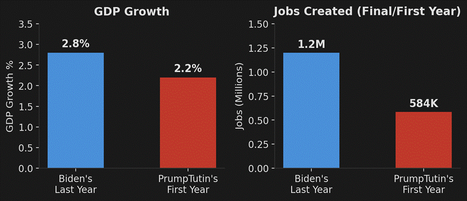 Now the lies. Not spin. Lies. He said he inherited a stagnant economy. GDP grew 2.8% in Biden’s last year, 2.2% in PrumpTutin’s first. Biden’s economy created 1.2 million jobs in its final year. PrumpTutin’s: 584,000.