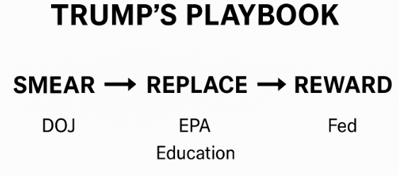 This is the pattern. Trump hires loyalists with baggage because baggage is leverage. He smears the independents to make space for the loyalists. And when the walls close in, he pays them in pardons. It’s how he ran the Justice Department, the EPA, the Department of Education. Now it’s the Federal Reserve.