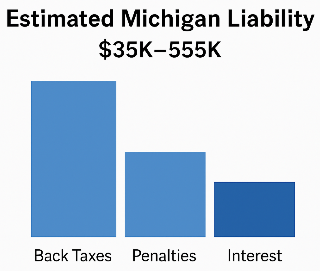 - Estimated Michigan liability: $35,000–$55,000 in back taxes and penalties.