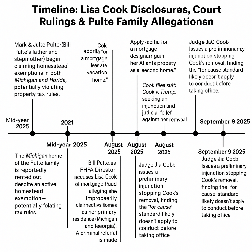 - Lisa Cook: Loan labeled her condo a second home. No Georgia exemption claimed. Judge blocked removal.